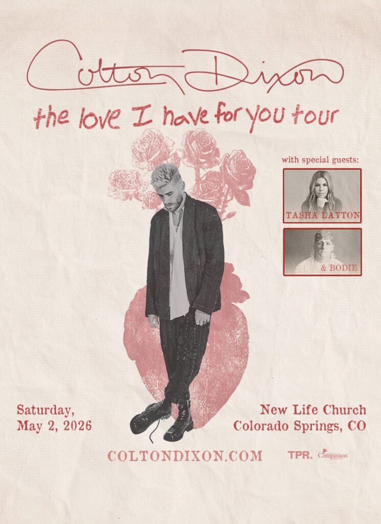 Get ready for an unforgettable night of music and inspiration as Colton Dixon’s The Love I Have For You Tour hits Colorado Springs this May! Colton brings his signature energy and powerful vocals to the stage, sharing new music along with fan favorites. He’s joined by special guests Tasha Layton and bodie, making a stacked lineup of worship and moments you’ll remember long after the night is over! *VIP: VIP Ticket includes premium seating and access to exclusive pre-show photo opportunity with the artists. VIP doors open at 5:30 p.m., and VIP ticket holders must arrive by 5:45 p.m. to take advantage of this opportunity.